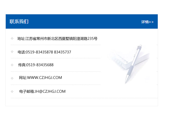 地址:常州市新北區友邦商務大廈1幢16、17層  電話:0519-85101652  傳真:0519-85112595  郵編:213022  網址:www_cz-jiayue_cn.shnaiqi.com  郵箱:xiajifengaa@163.com